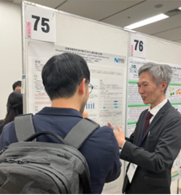 二つ目は、同じ名古屋ラボの鵜飼部長(写真②)から、近年注目されている多重特異性抗体(一つの抗体で複数の標的を認識できる抗体)の作製技術において、生産効率や安定性を向上させる「L鎖共通化技術」を提案し、医薬品製造分野の課題解決に貢献するという発表です。既存の抗体でも、これから新しく作製する抗体にも適用できる汎用技術として多重特異性抗体の開発が推進されることを期待しています。